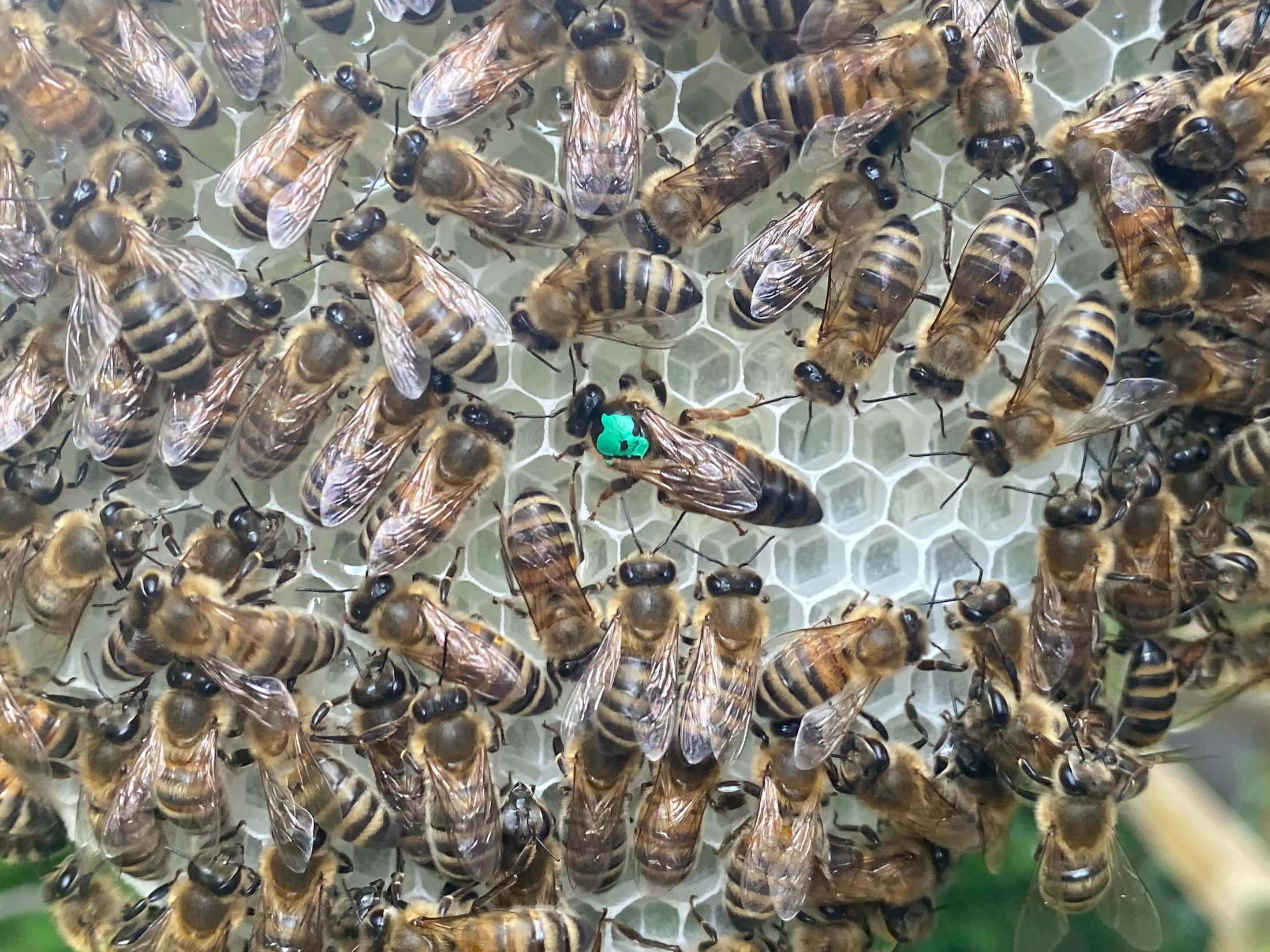Was Sie bekommen: Eine begattete und gezeichnete Jungkönigin im Zusetzkäfig mit ca. 5 Begleitbienen.